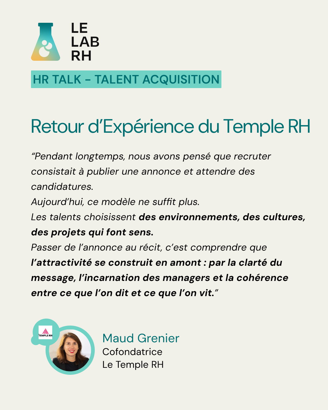 - Maud Grenier, Cofondatrice du Temple RH, nous a proposé un format court et percutant : “De l’annonce au récit : attirer les talents par la communication RH”.